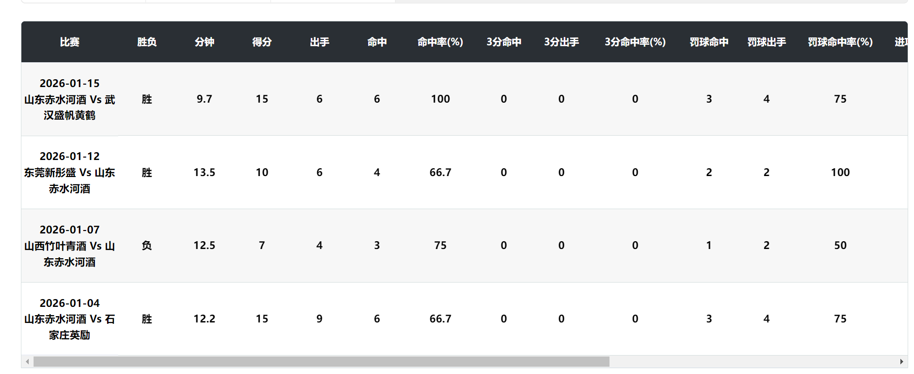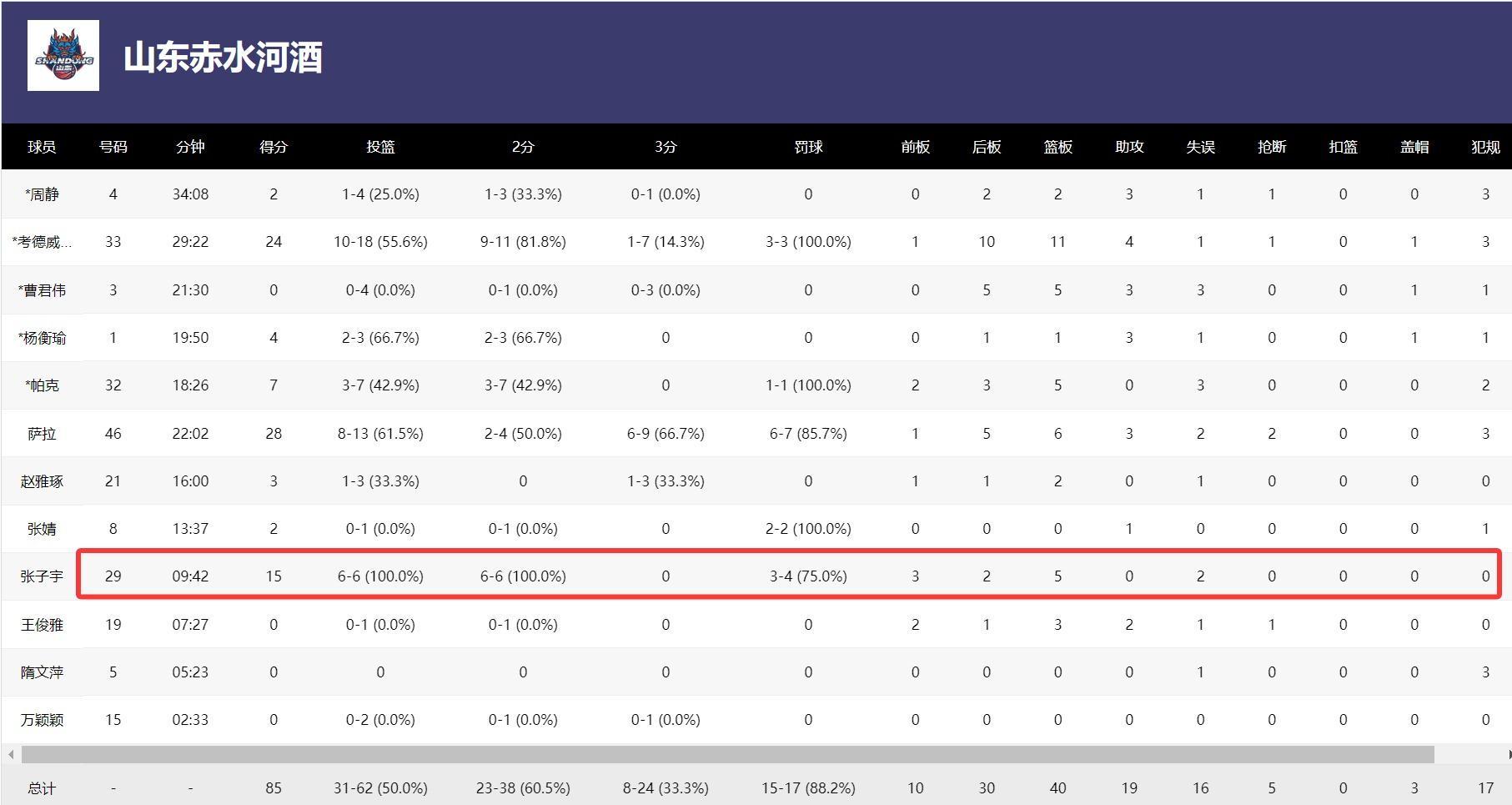北京时间1月15日,WCBA常规赛,山东女篮85-76击败武汉盛帆女篮,这场比赛中国女篮超级新星张子宇登场9分42秒,6中6,拿到15分5篮板,命中率100%,这场比赛张子宇打出了他登陆WCBA最高效的一场比赛。